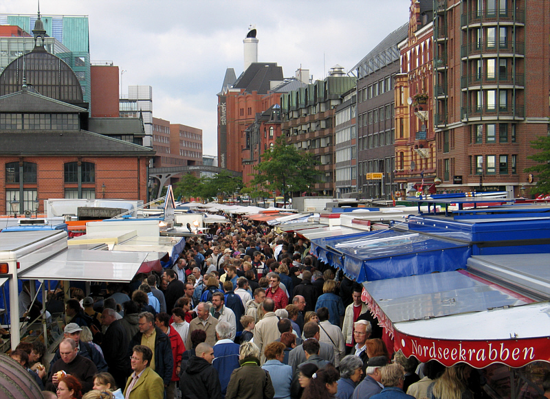One great thing about Saturday nights in Hamburg is the Fischmarkt on Sunday morning. Opening 5-ish, it’s an invigorating mix of very proper early-morning shoppers, and the dazed-and-confused remnants of the night before. Like us. There are fish, plants, bad bands, coffee, beer, and most importantly bratkartoffeln mit spiegelei – an enormous mound of fried potatoes (mit speck und zweibeln) with three fried eggs on top. Just the ticket.