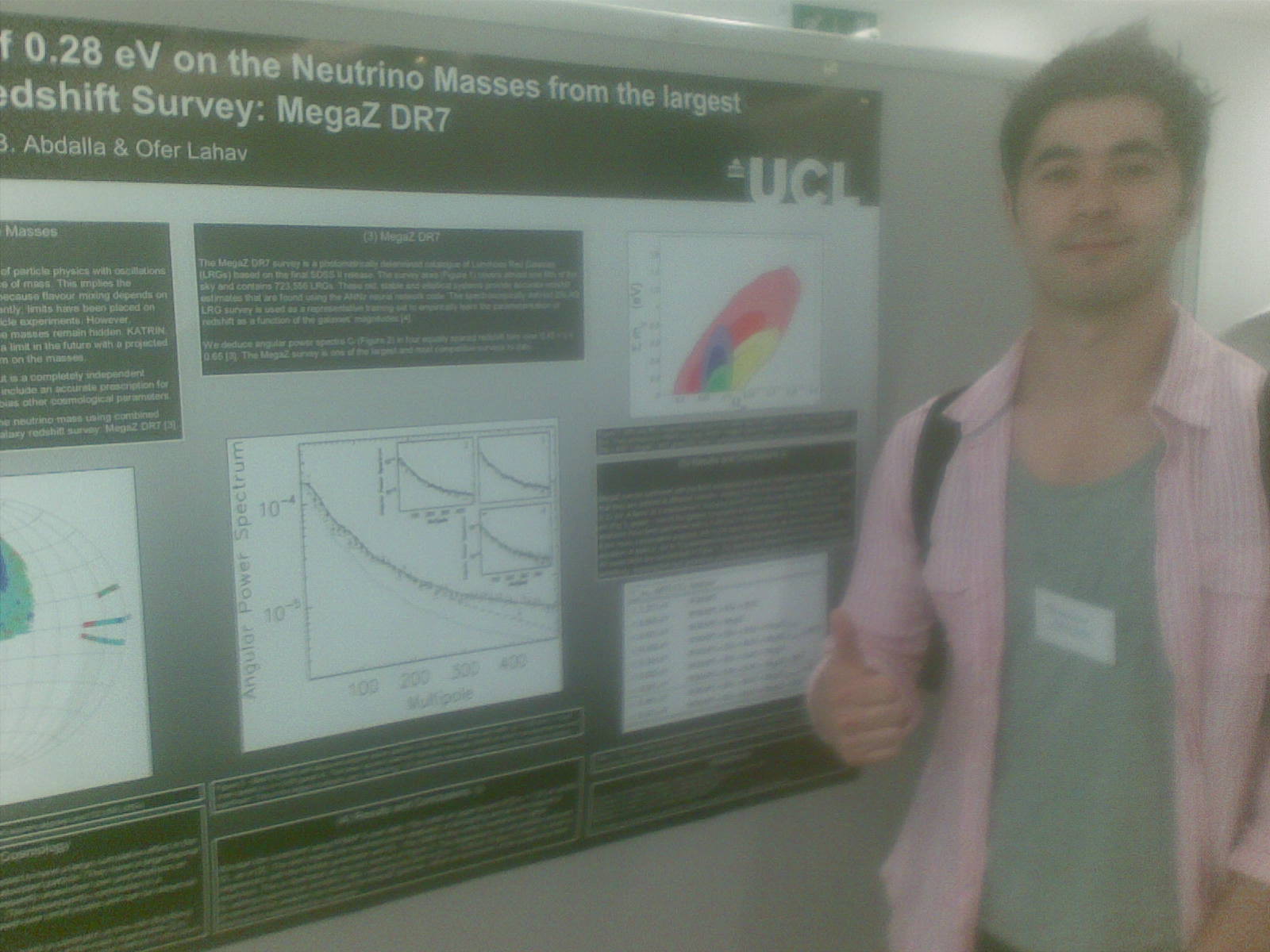 For example, neutrinos. Here’s a bad picture of Shaun standing in front of his poster today which explains how cosmologists get a better limit on neutrino masses than anyone else. I will be very interested to see, once the neutrino mass is measured, which cosmological assumptions they tweak first to get the right answer. It’s really good work though – pushing the consistency of current models until something creaks. Proper science. And they got a good write up on the beeb, which also included the first tau neutrino appearance at Gran Sasso, plus the *really* weird result from MINOS where they see a different mass difference between anti-neutrinos than that between neutrinos. If this is true (currently they quote a 5% chance that it isn’t) then this is an amazing result, which will utterly change our view of the universe (CPT violation, go figure..). I would bet on it not being true, but it is a reminder of how little we know and how much there is to find out about where we live. Then D0 seem to have found CP violation which ain’t in the standard model. (This measurement had major STFC-funded UK involvement from Manchester and Lancaster, but for some reasons STFC didn’t bang out a press release I can find). These things may pass, but right now, to quote Kate Bush, I just know that something good is going to happen. Ok, I don’t *know*. But just saying it could even make it happen. And still the LHC data roll in.