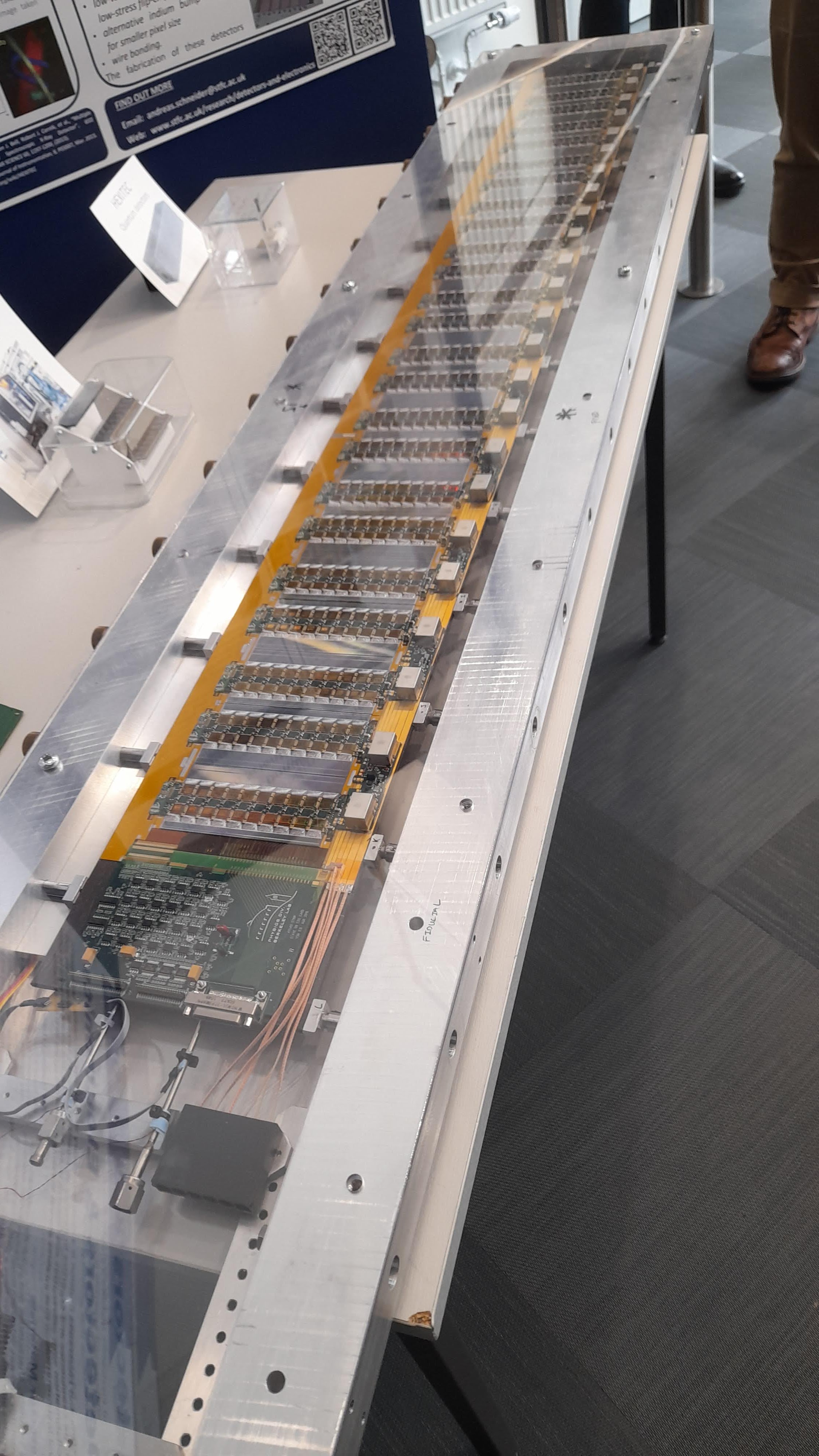 Since I intend to be analysing data from it for the next decade or more, it was satisfying to see a stave of the ATLAS Inner Tracking Detector upgrade, and peer through the window at the clean room where the detector is being assembled. Even though this is “my experiment” in one sense, this is the first time I’d seen this. The stave is an array of silicon detectors delicately bonded to their readout electronics. You can find more information here.